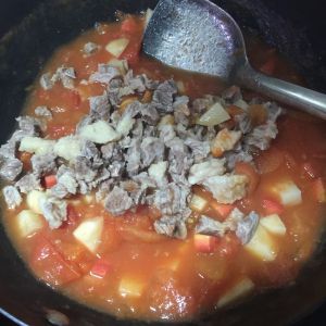 第四步,熬好的西红柿酱汁里依次放入土豆丁胡萝卜丁牛肉块。
