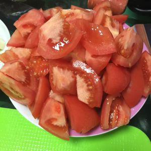 第三步,锅里放油微热西红柿下锅翻炒加盐出水熬成酱汁。