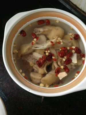 把鸡煮好后用温水冲一下,这样炖出来的鸡汤比较清澈,然后把鸡放到砂锅里,然后把配料放入,