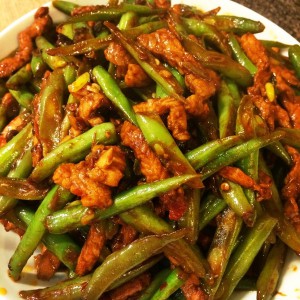 所有食材准备好 四季豆切好 里脊切丝后 加料酒 生抽 少量老抽 生姜粉和生粉搅拌均匀腌制十分钟