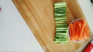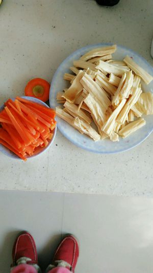 将腐竹泡发洗净,用开水焯2分钟即可捞出,时间不宜过长。胡萝卜切细条。