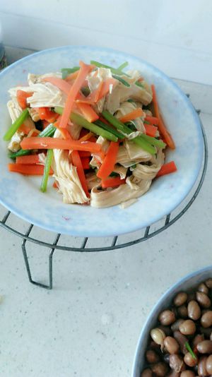 热锅加油,放葱花,姜丝爆香,放入胡萝卜翻炒,再放腐竹,药芹一起翻炒,放适量的盐,滴几点六月鲜酱油即可,最后撒上适量黑胡椒粉,即可装盘。