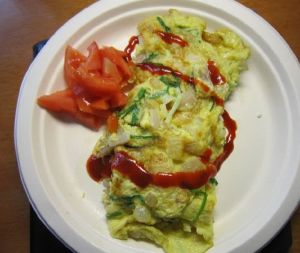 最后装盘,装鸡蛋时,最好叠三次,洒点胡椒粉,装完盘,上面点点番茄酱,旁边在切点西红柿一起食用,这样更清淡。完毕。