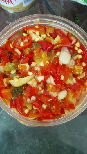 把所有食材混合。加适量盐,糖拌匀。装瓶,别装太满,会胀漏。三天就可以吃了。棒棒的。