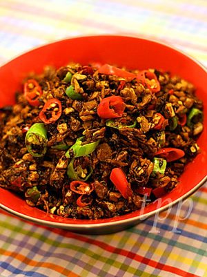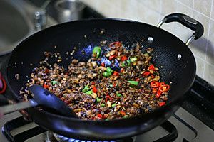 下入外婆菜翻炒,加少量鸡精炒匀即可起锅