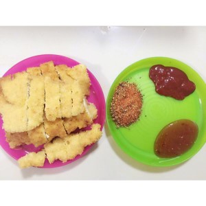 鸡胸脯切片,加入腌料,然后抹一层黄油