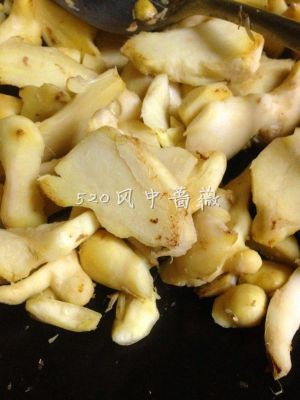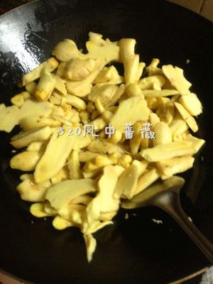 将切好的姜放进锅里炒干水备用,炒时候放点盐,少少就可以了,炒至姜略黄即可。