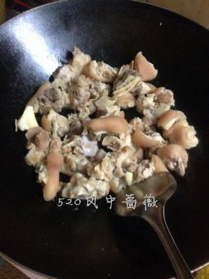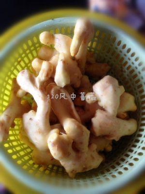 将猪脚去毛,洗干净飞水,再用冷水洗一遍;放锅里炒干水,不用放油,炒时候可以放一点点盐,要慢火炒哦,稍微有点黄就可以了