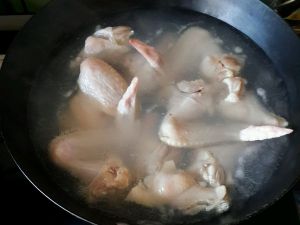 鸡翅洗净,用刀划几刀,放一勺料酒,焯十分钟,去血水