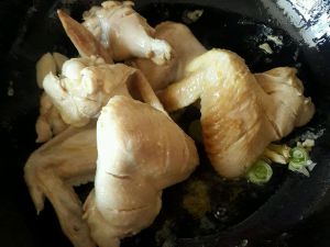 锅里放油,白糖熬糖色,将鸡翅放里翻炒,加葱酱蒜