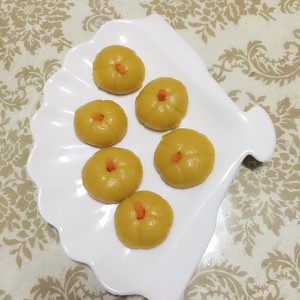 把所有的面团都用勺子的柄在面团上压几道像南瓜的印子