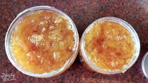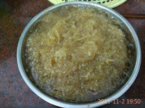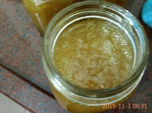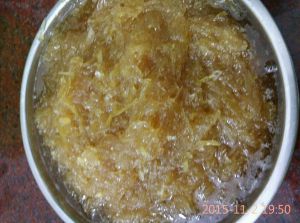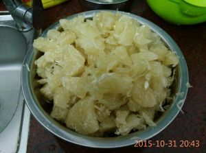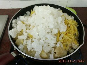 把柚子皮、柚子肉、一斤冰糖、3碗水放在锅内煮1个半小时,把水煮干为止
