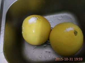 用手把柚子皮用盐擦5分钟,把柚子皮上的脏东西弄丢
