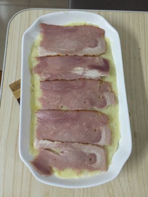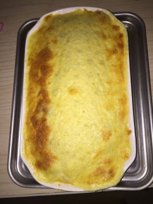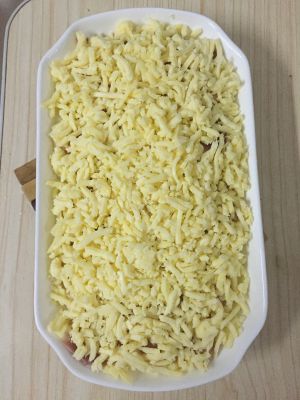 然后铺上一层马苏里拉芝士,烤箱上下火预热至170度,放进去烤10分钟左右,芝士有点微焦就可以了
