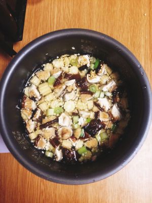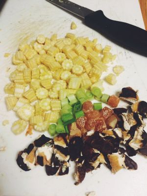 玉米笋改刀,葱切粒,干香菇掰碎(也可以泡发后切粒),干贝不需要泡