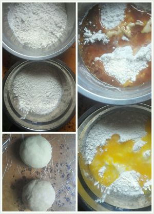 准备两个盘子把面粉放进去接着把搅拌好的糖水分别放进去搅拌揉面,弄成团