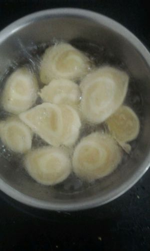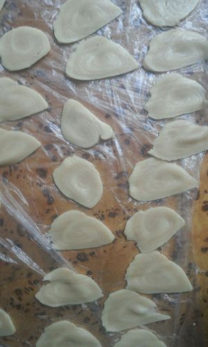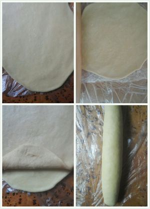 把两团面粉用压面棒压成片装,把红糖的片状放到白糖的上面,接着就卷成柱状(必须卷结实,不然切的时候有缝隙)