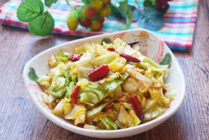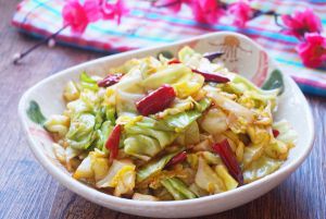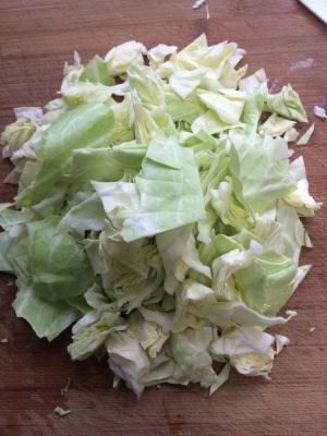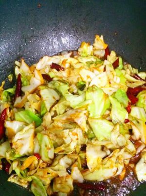 加入包菜块儿翻炒,加适量盐,2饭勺生抽,半勺白糖,一勺醋。