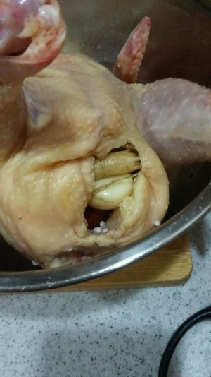 将鸡的内脏去除洗净,将糯米、蒜头、2颗大红枣、栗子和人参塞入鸡肚子里,用棉线或者竹签等将鸡肚子封起来