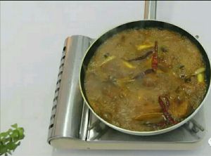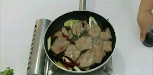 放入咖喱粉,生抽,老抽,鸡精,白砂糖,料酒,煮制20分钟后收汁