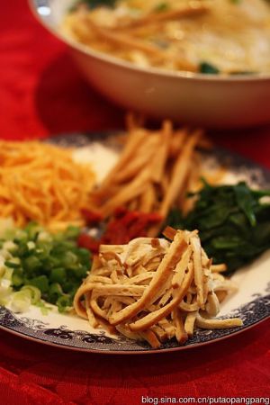 依次码放入盘中;与此同时,将已煮好的米线放入大碗内,浇上滚烫的鸡汤,再把自己喜爱的配料添入碗中,齐活啊,享受就成!