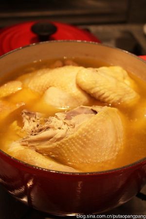 鸡汤做法:整鸡或半只鸡,入开水锅,锅开后,喷入少许花雕,放入一大块拍碎的姜块,盖上锅盖,大火煮,待其开锅后,调至小火慢笃1.5-2小时即可。