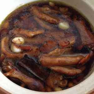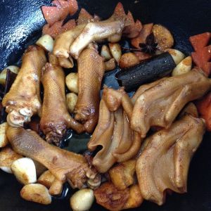 倒入爆炒过的鸭掌,加水,水平过鸭掌即可,大火烧开,撇去浮沫,加盖转小火焖制20分钟左右;