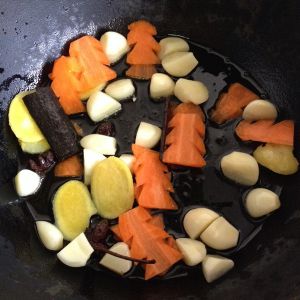 起油锅,锅热倒入橄榄油,热锅热油放入姜片、蒜粒、香料,爆出香味,加入胡萝卜片,翻炒片刻;