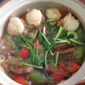 开盖,放入扇贝、青红椒,大火烧开,转中火,加盖烧4分钟,开盖,加葱段、鸡精,关火,上桌。