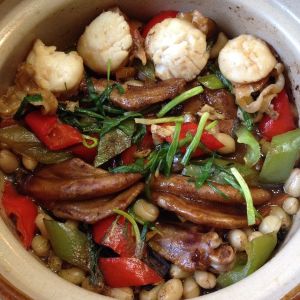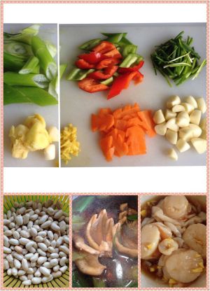 大葱切大块,青红椒切菱形块,香葱切段,生姜切片和切粒、胡萝卜切片;花生仁去衣;鸭掌焯水:锅中加水,放入鸭掌、桂皮、八角、香叶、生姜和大葱块,水开加料酒1汤匙,生抽1汤匙,转中小火焯烫2分钟,撇去浮沫,捞出鸭掌和香料;扇贝取肉,加生姜粒、料酒1汤匙 、蚝油1汤匙腌制10分钟备用;
