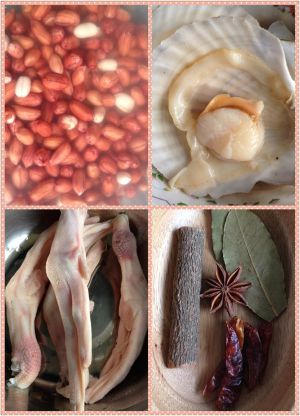 花生仁浸泡一晚,扇贝、鸭掌清洗干净,准备好香料;