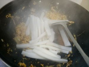放入年糕,翻炒均匀,接着放入生抽,酱油,盐。
