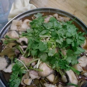 放入香菜~完工,下雨天酸菜鱼和米饭很配哦,因为买的调料包,口感麻辣,中间我幸好在锅底放入少许白糖,综合一下,不然广东人可能吃不了哦~