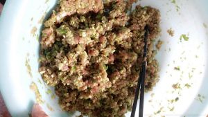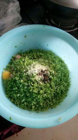 把猪肉跟芹菜剁碎,芹菜水分比较大,剁碎之后用水挤压把水分挤出来。然后加入鸡蛋(我们这放鸡蛋是说饺子馅不容易散开)盐,鸡精,酱油,油,这些都适量而放。