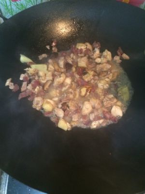 下油放蒜先爆炒雞肉粒、瘦肉粒、臘腸粒