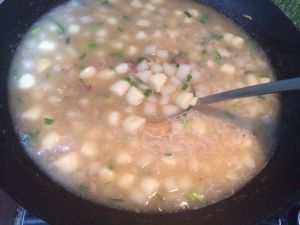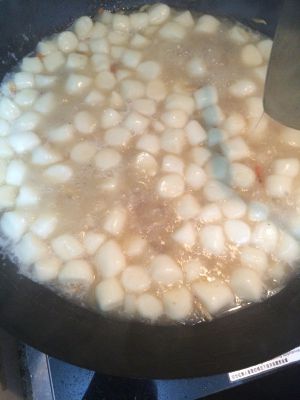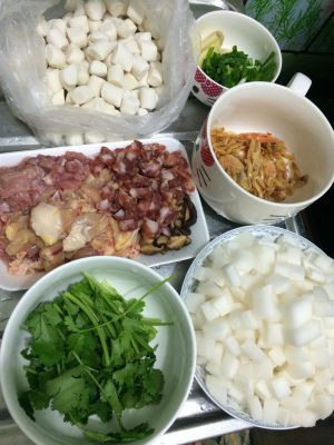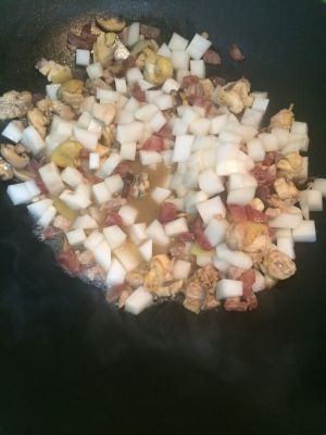 添加白蘿蔔粒炒,再陸續添加冬菇粒、蝦米、干瑤柱、蛤蜊、薑絲,翻炒後放鹽、醬油及雞粉再加大量清水滾