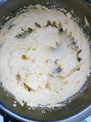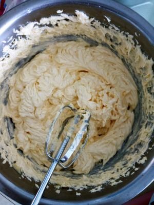 在黄油里加入3颗鸡蛋,一颗一颗加入。每次都要充分打发融合。