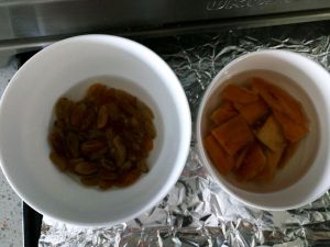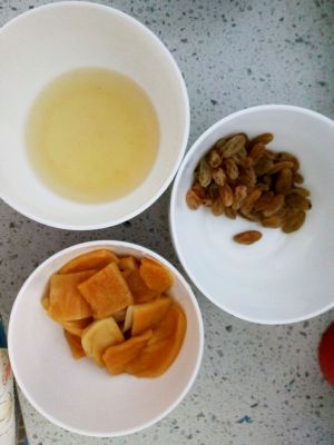 各项材料称好,提前用凉白开水泡芒果干,水刚好就好。用朗姆酒泡葡萄干,干好够泡就好。