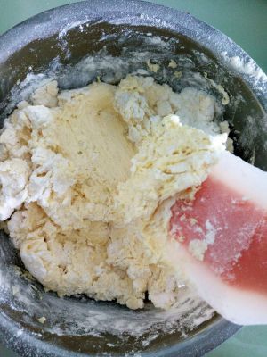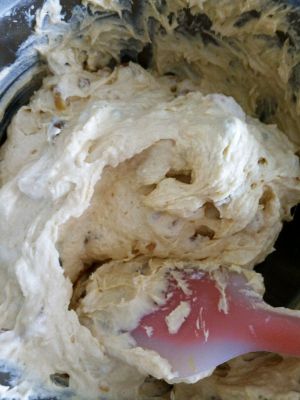 把低筋面粉和泡打粉混合后,筛入打发好的黄油糊里。用刮刀翻拌均匀。
