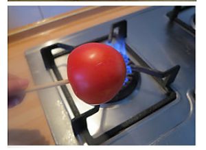 蕃茄插在筷子上用火烤至皮裂后去皮;