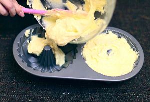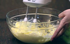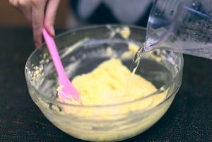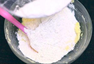 将雪碧和面粉分三次交替加入到黄油糊中,每次都要翻拌均匀。