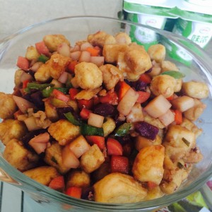 重新炝锅,放入火腿丁,胡萝卜丁,土豆丁,紫薯丁,炒一会儿再放入青椒丁
