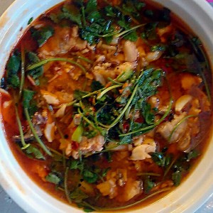 把锅洗净,擦干水。加适量油,放入花椒爆出花椒的香味,捞出弃去。热油迅速浇在煮好的鱼上,有吱吱声,这样香味才会出来。这步是关键。