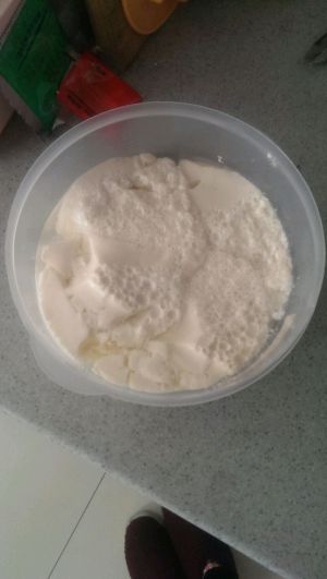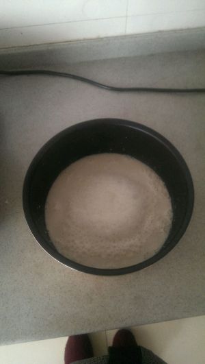 把内脂倒入一个大锅里,将搁置两分钟后的豆浆高高地冲入锅中。不要搅拌。盖上盖子静待20分钟。