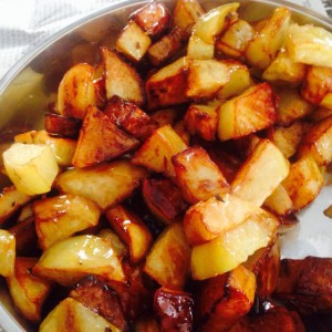 水和糖同时倒入锅内、大火烧开,勺到冒白泡,水逐渐的少(这个过程其实水与糖逐渐融合了,只是会比较慢),糖水变黄、小细泡特别多、水基本与糖完全融合调制小火,用汤勺顺时针快速调、这样不会糊,而且能掌握好度。看到糖水彻底变少、而且粘稠了,把炸好的地瓜块倒入翻炒出锅