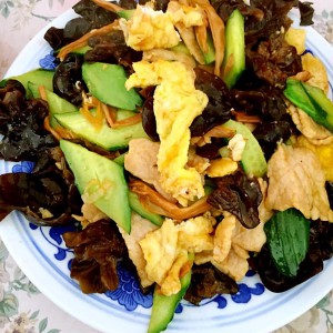 葱姜爆锅,依次下入木耳、黄花,炒一小会儿放入黄瓜片、肉片、鸡蛋,然后加入鸡精,少许酱油,蚝油调味,出锅前加入味精和香油。