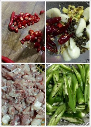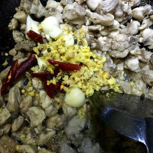 把油倒出来,肉留在锅里,干辣椒,蒜,姜,花椒,下锅炒