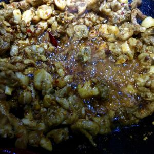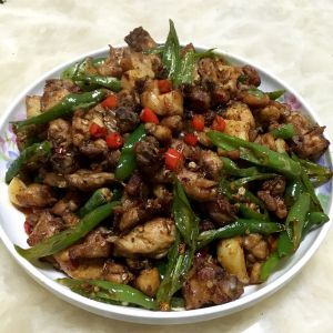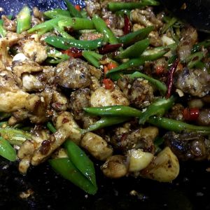 翻炒出香味以后加入青椒和切好的小米椒。青椒7分熟之后加味精和盐,熟的花生米,出锅