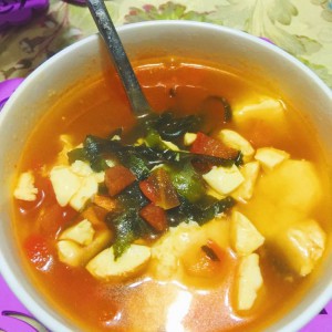 倒入油,油烧至八分热时,加入番茄,翻炒,加入矿物质水和豆腐。