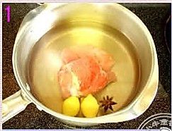 水烧开后放入瘦肉、生姜、八角、料酒汆出血水,捞出肉块洗净备用;
